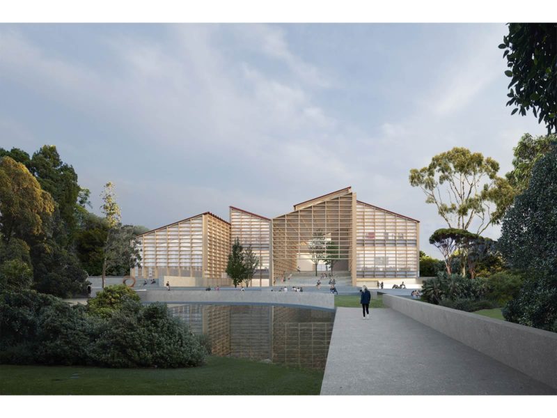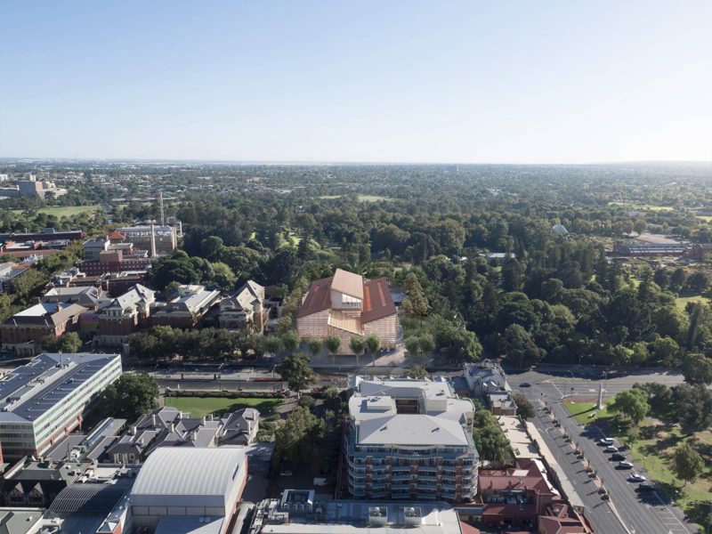 The building is a timber structure, comprising large screens and sloping roofs. Distinct from its neighbours, it sits comfortably as part of both city and garden, providing a threshold between the two. Volumetrically, three linear, staggered bars extend from North Terrace toward the Botanic Garden. To the north and east, a landscaped garden creates a new vibrant, open space in Adelaide. The Gallery of Time sits at the heart of the building, while areas for further display, learning, debate and engagement are located on the exterior, visible to the city.