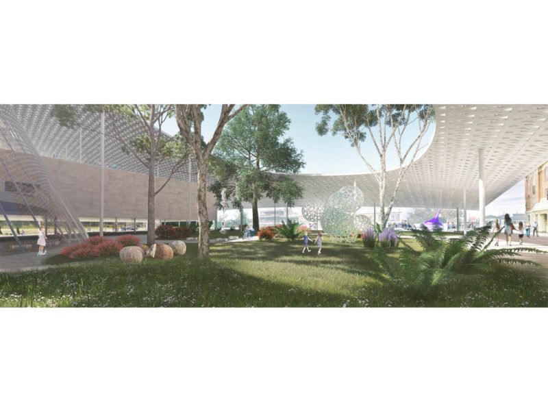 Like a park where different activities happen simultaneously, this place gathers a museum, public spaces, nature, people, terraces and sculptures as part of one realm. We envisioned a large roof to create a comfortable, shaded place to invite people underneath. While providing soft shade, the horizontal gesture of the roof creates openness on all sides so breeze and nature flow through. By creating a large roof floating above the place, we had a feeling it could become a place in Adelaide where people gather, spend time and meet art; where they use the place freely as they imagine.