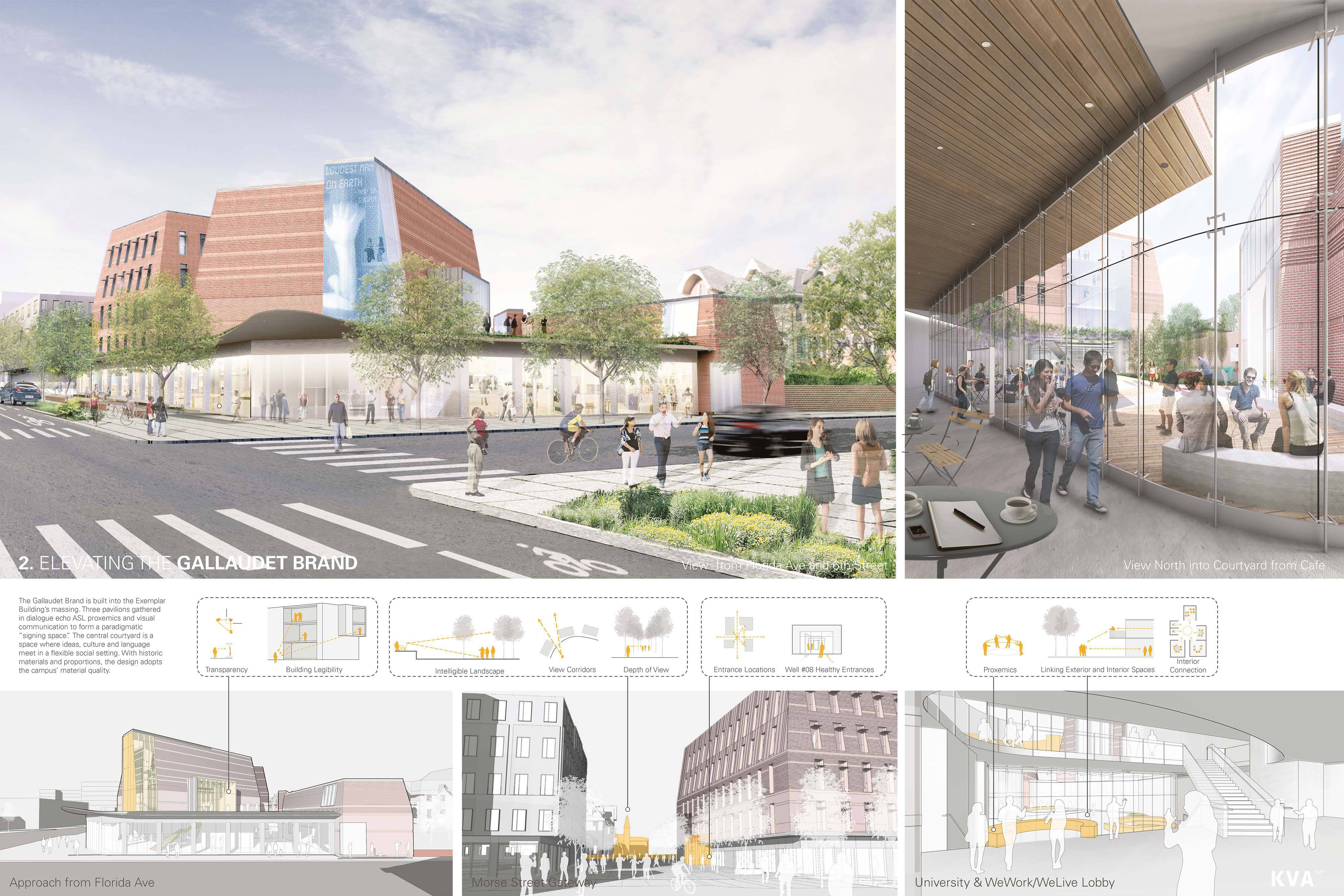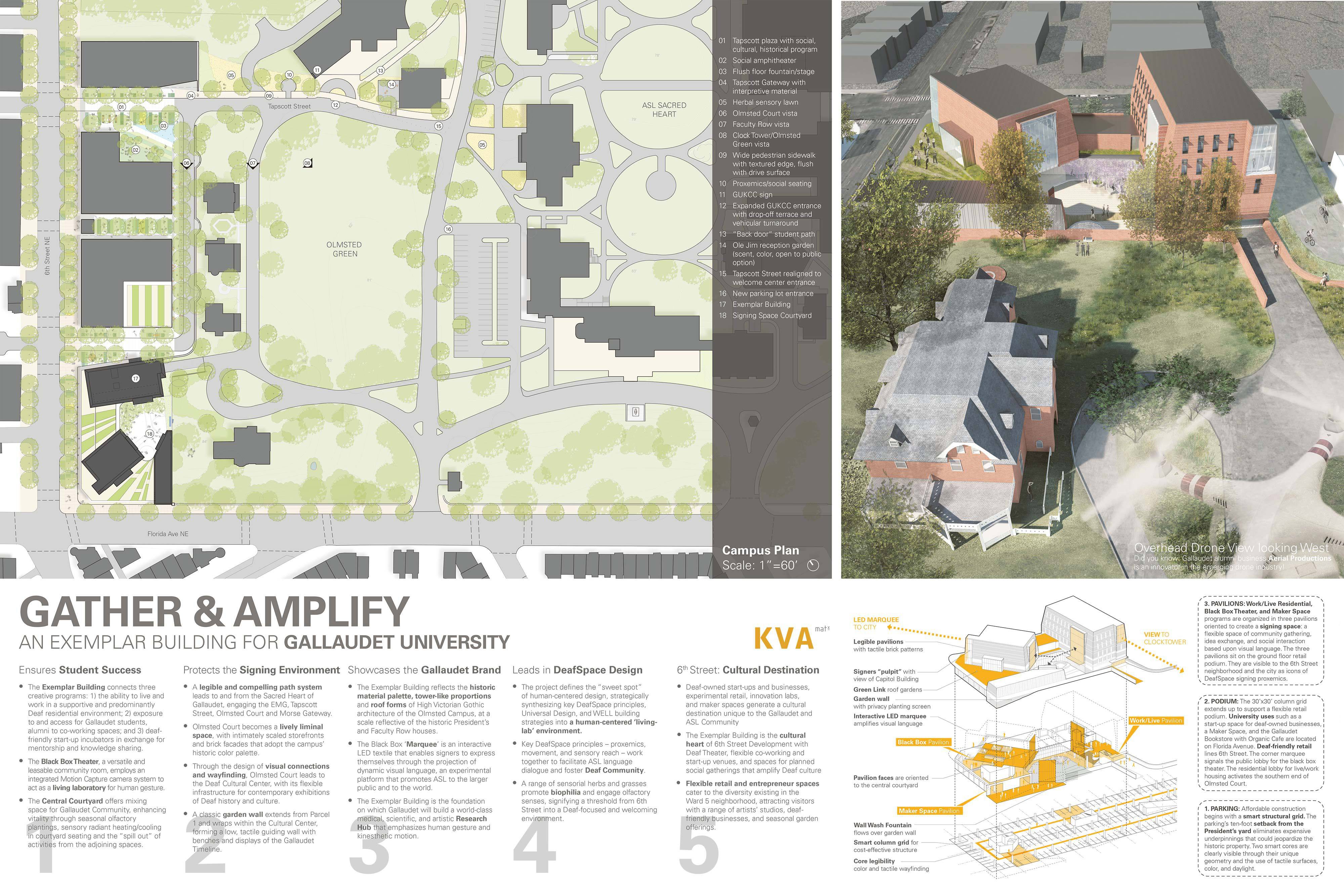 The Gather & Amplify project is inspired by the kinesthetic and spatial relationships that are fundamental to DeafSpace concepts. Led by Kennedy & Violich Architecture, the project builds an inclusive environment at Gallaudet University that generates educational, creative and economic opportunities for the Gallaudet community, adjoining Neighborhoods and the City at large.