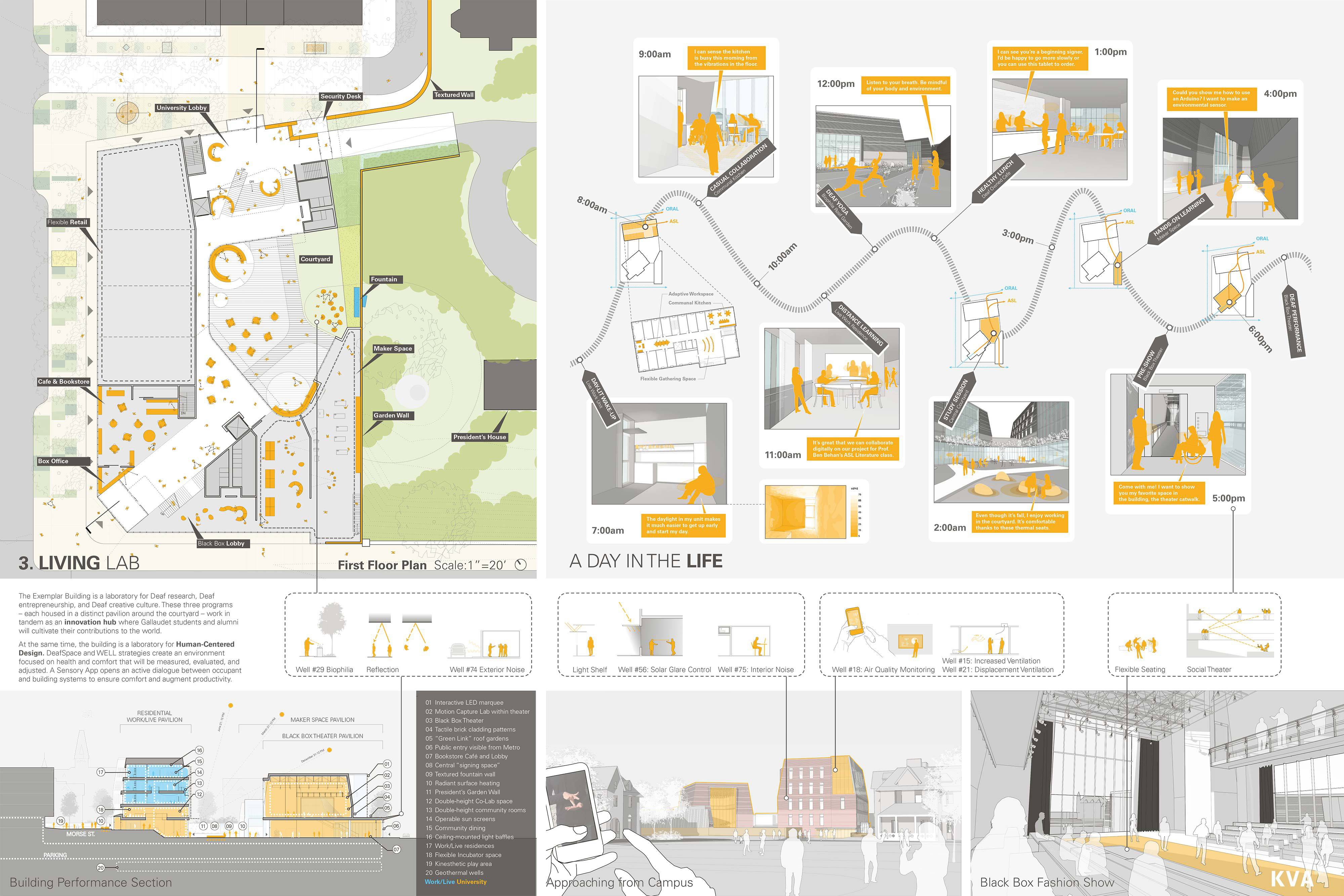 Gather & Amplify combines three unique creative programs for Gallaudet, Work/Live Residences and University resources, a versatile Black Box Theater, and Creative Incubator spaces for Deaf owned businesses organizing these into three distinct and legible pavilions linked through kinesthetic movement, circulation and views.