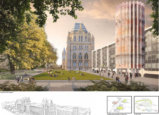 Our concept is to release the grounds and buildings to flow in a way that creates space for the science and allows visitors to enjoy and understand the latest thinking on the natural world. The Waterhouse building is given back is calm landscape setting flanked to the east by a new green square at street level, with a caf� and exhibition space beneath, and to the west by a new garden researching the critical roles of water, soil, plants and air in the centre of a city. Universal access is made possible from South Kensington tube and the grounds unfold from east to west, telling the story of the earth from deep geology to future nature.