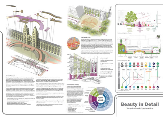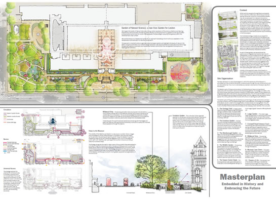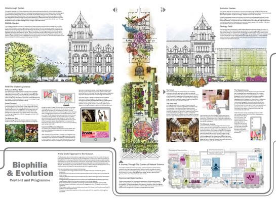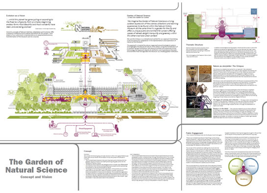 We imagine the Garden of Natural Science as a living, outdoor expression of the science, collections and learning experiences to be found within the Natural History Museum. At the same time it is a garden for the city and offers a unique public environment for London offering spaces of retreat, delight, tranquillity and greenery within this otherwise hard urban context. We use the octopus as a metaphorical symbol for our approach illustrating a line of continuous adaptation in the representation and exploration of nature at the Museum. Using the combination of a coherent design framework, real physical exhibits and advanced virtual technology, the approach depicts an authentic and inspirational thematic environment that reinvigorates the Museum as a leading global institution.