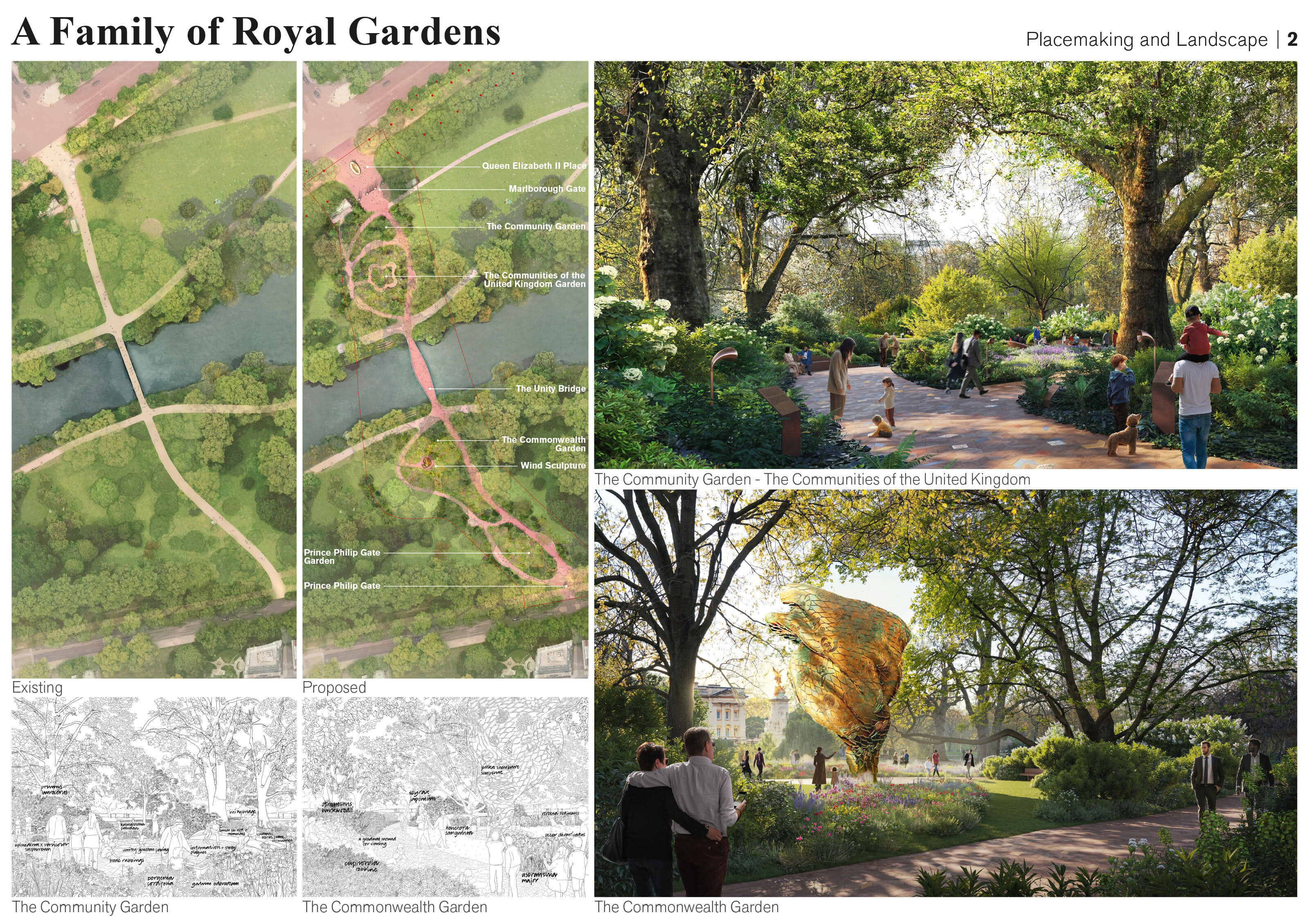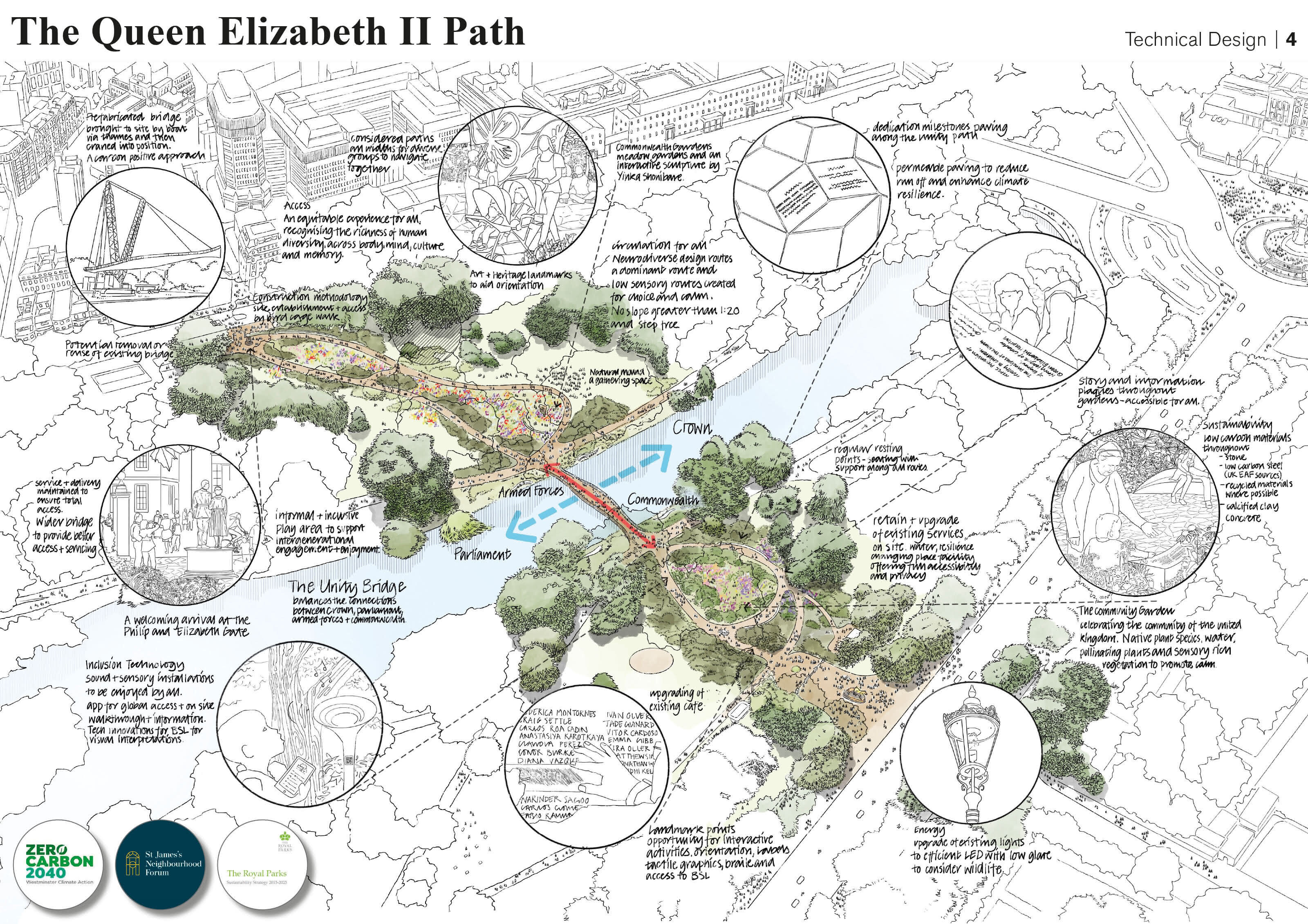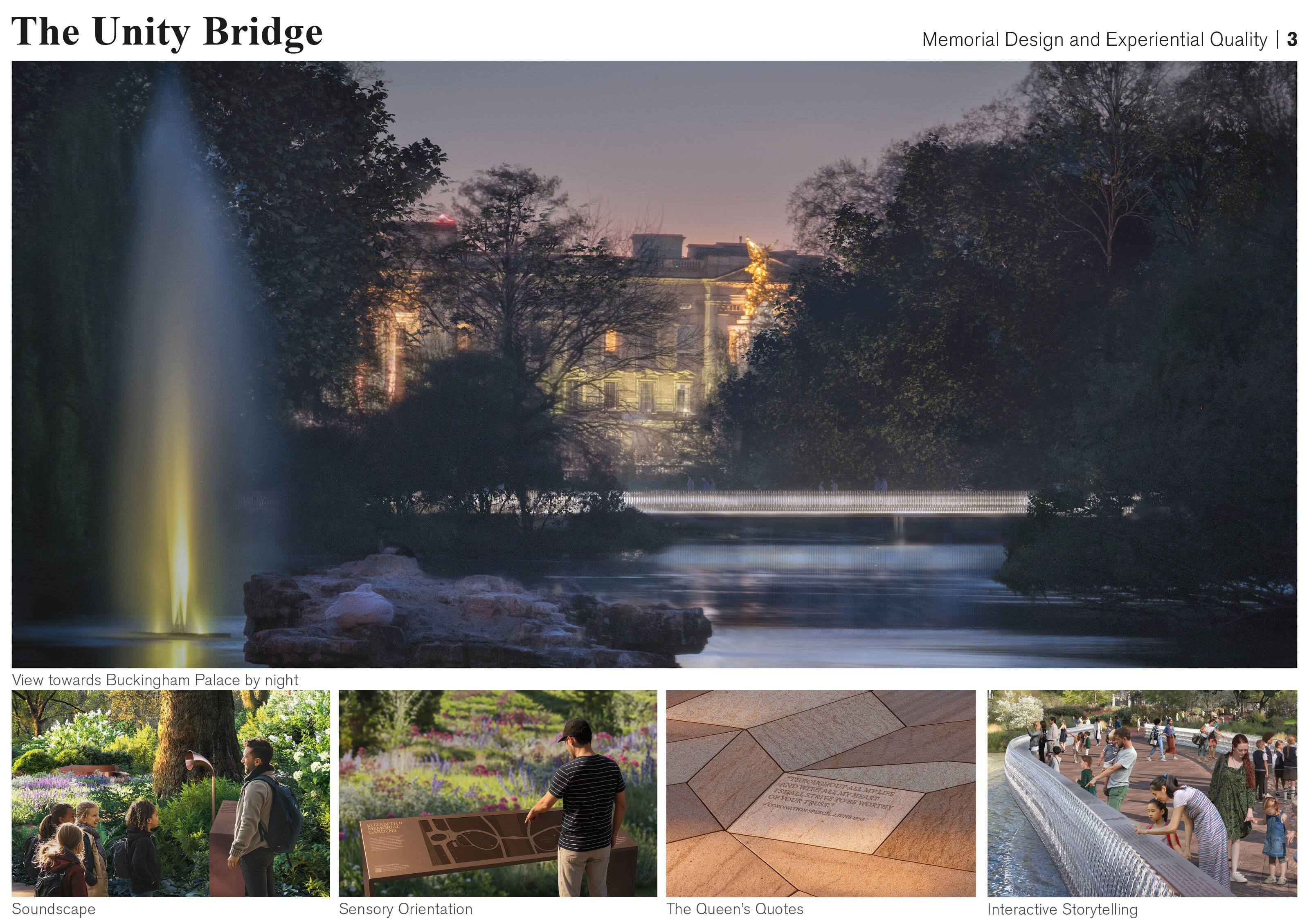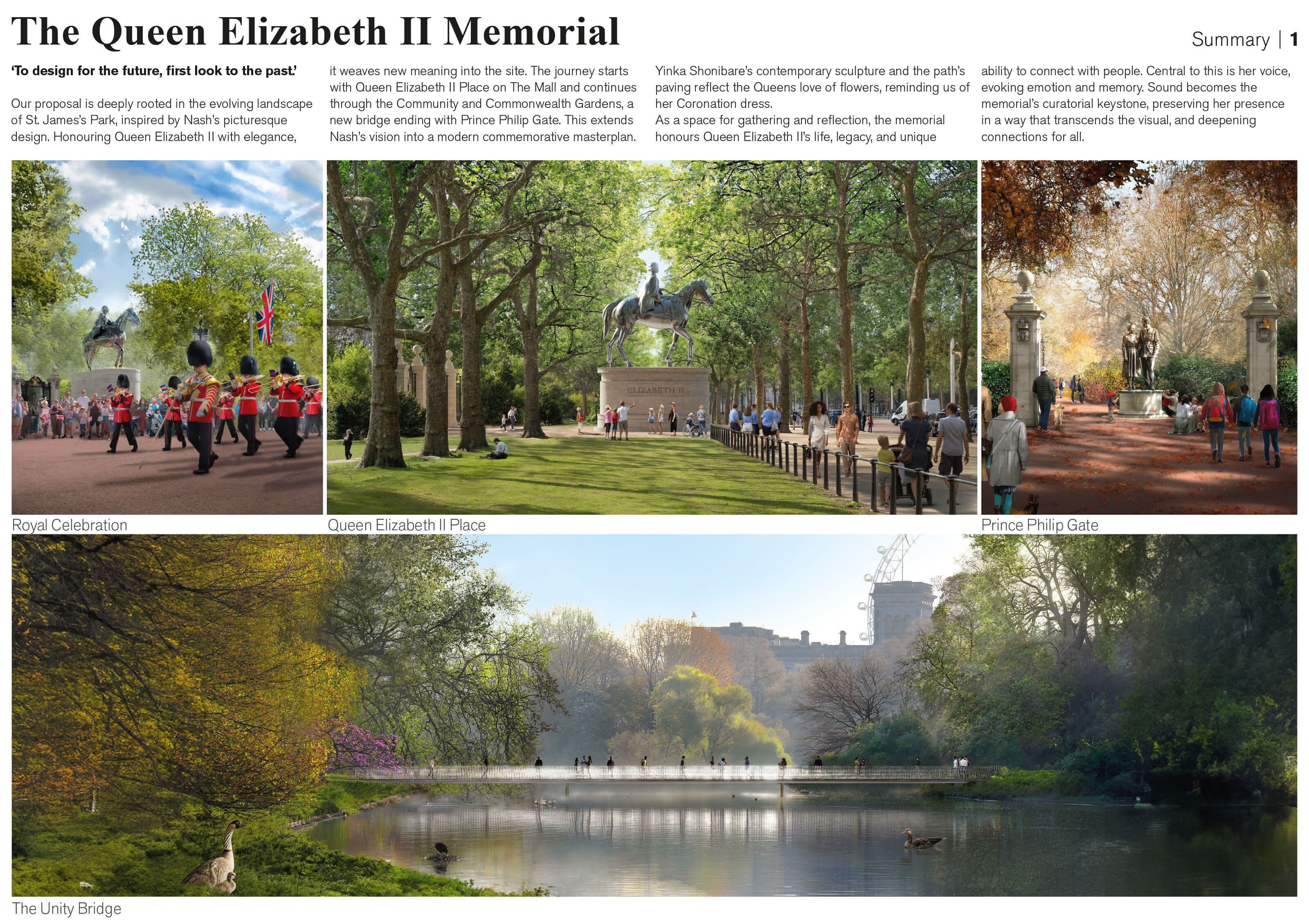 Foster + Partners’ proposal honours Queen Elizabeth II’s ability to unite people, communities, and nations. The journey through a tranquil family of Royal gardens is inspired by John Nash’s original romantic landscape, unified by a natural stone tessellated path from the United Kingdom and Commonwealth that meanders to cater to both commuters and visitors. New figurative sculptures of Queen Elizabeth II and Her Majesty alongside Prince Philip at Birdcage Walk, mark the relocated Marlborough Gate and Prince Philip Gate. Between the gates, the Commonwealth Garden and Yinka Shonibare’s Wind Sculpture define a space for reflection and shared experience; the Community Garden’s artistic installations celebrate the diversity of the United Kingdom; and the Unity Bridge is a jewel crowning the path and Memorial journey. Throughout, the Queen’s voice is ever present through audio installations and inscriptions, alongside an ever-evolving digital conservatory, accessible from the site, or anywhere in the world.