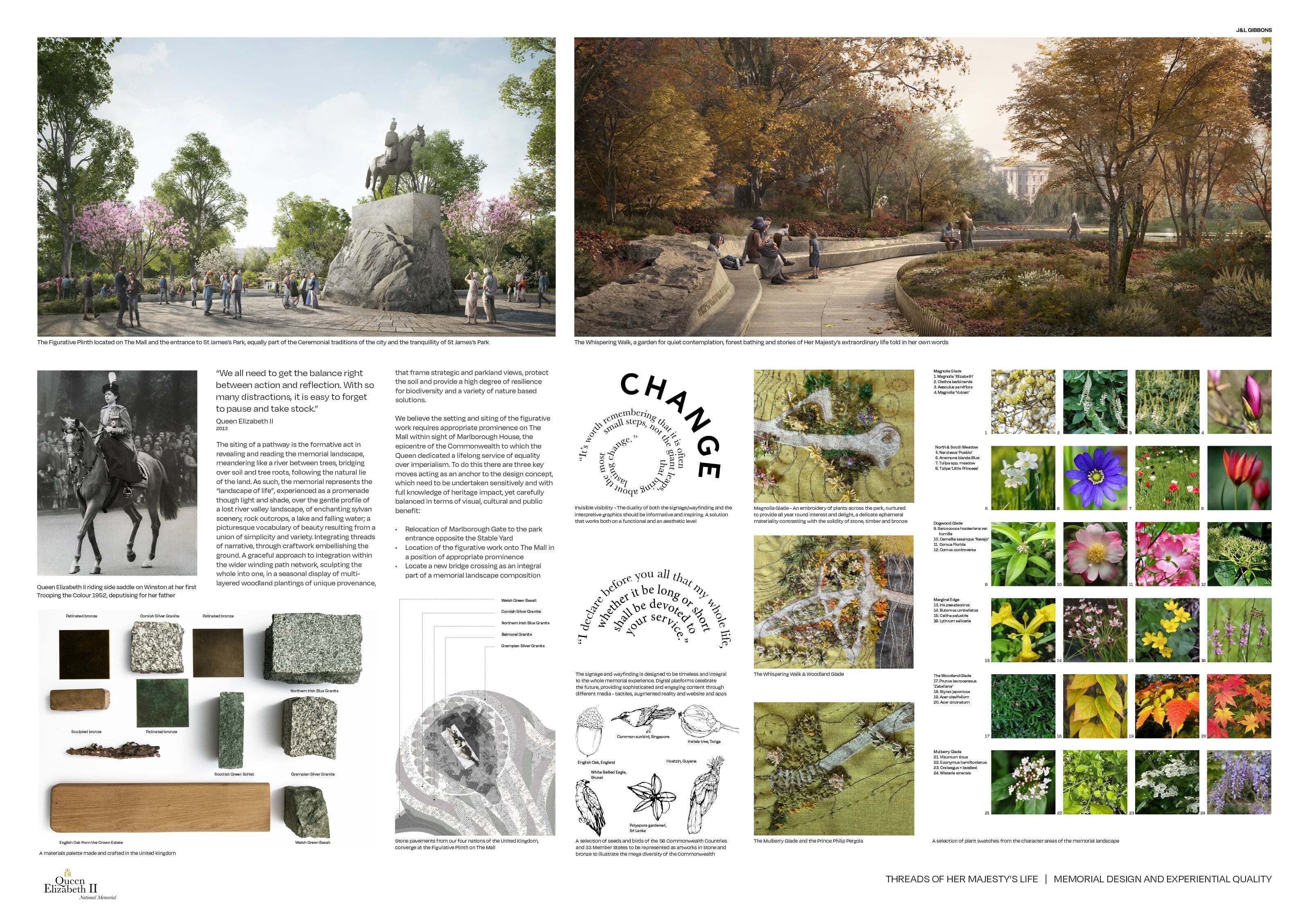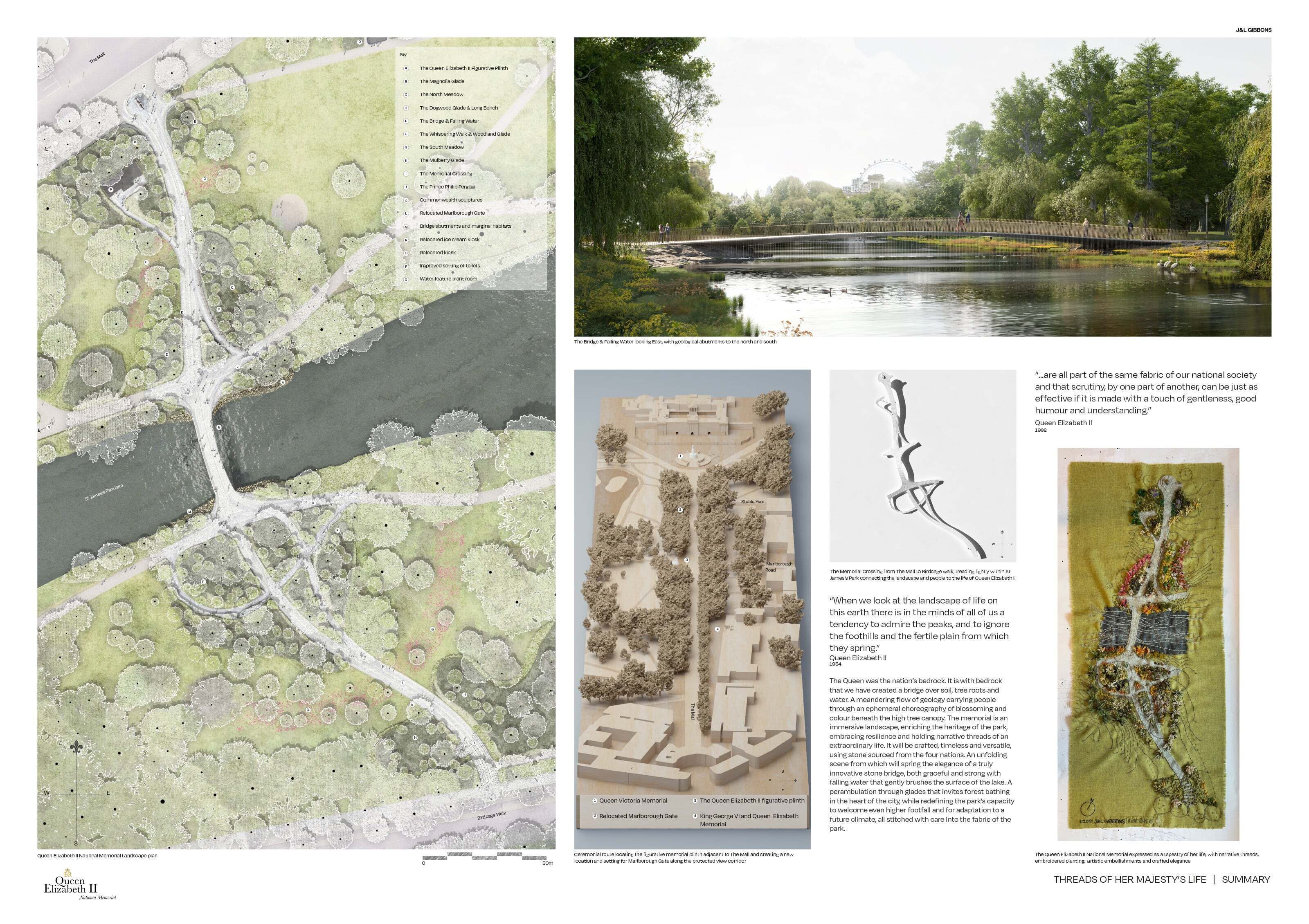 The Queen was the nation’s bedrock. It is with bedrock that we have created a bridge over soil, tree roots and water. A meandering flow of geology carrying people through an ephemeral choreography of blossoming and colour beneath the high tree canopy. The memorial is an immersive landscape, enriching the heritage of the park, embracing resilience and holding narrative threads of an extraordinary life. It will be crafted, timeless and versatile, using stone sourced from the four nations. An unfolding scene from which will spring the elegance of a truly innovative stone bridge, both graceful and strong with falling water that gently brushes the surface of the lake. A perambulation through glades that invites forest bathing in the heart of the city, while redefining the park’s capacity to welcome even higher footfall and for adaptation to a future climate, all stitched with care into the fabric of the park.